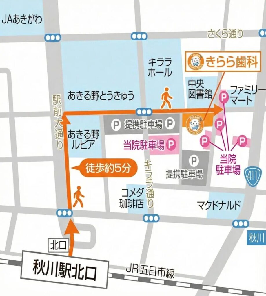 きらら歯科は、JR五日市線「秋川駅」北口から徒歩約5分、さらに無料駐車場71台完備で、電車通勤・車通勤どちらにも非常に便利な立地です。